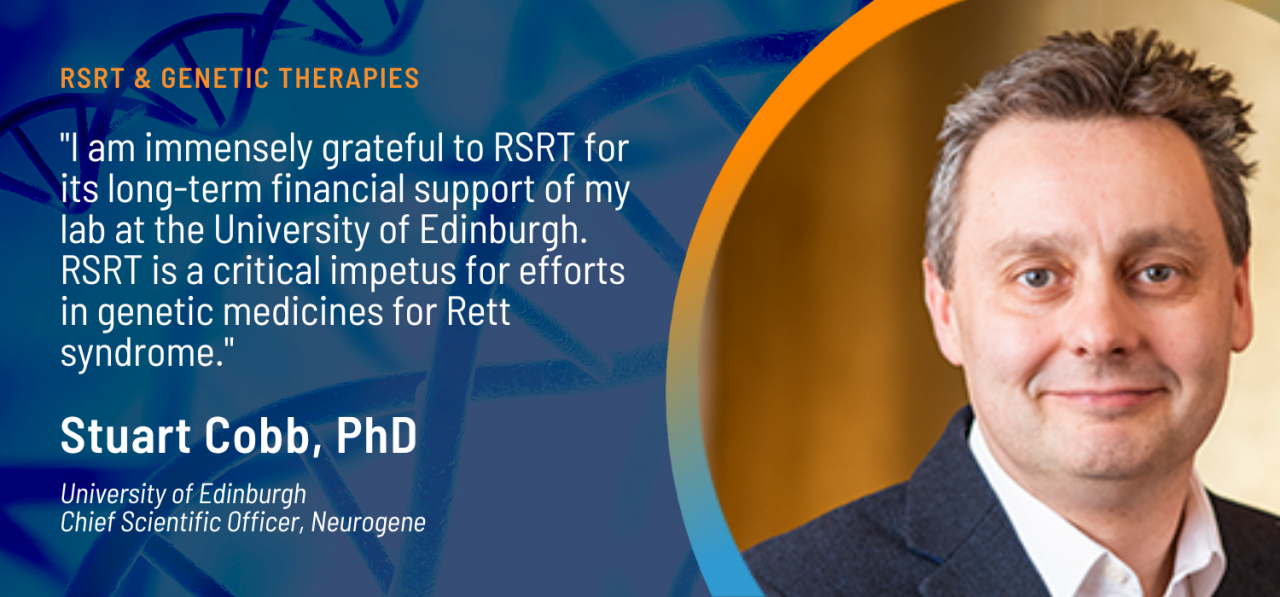 RSRT has worked very closely with Stuart Cobb, PhD, for over a decade and provided millions of dollars to his lab at the University of Edinburgh for the research that generated the gene therapy being used in the Neurogene trial. Dr. Cobb became Neurogene’s chief scientific officer following an introduction by RSRT to Neurogene’s CEO, Dr. Rachel McMinn. We are grateful to everyone at Neurogene for their passion and investment in the Rett syndrome gene therapy program.