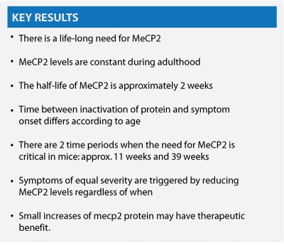 MC There are two potentially critically relevant points made in your paper. One is the fact that the half-life of the MeCP2 protein is two weeks. That could be relevant and encouraging for a protein replacement approach.