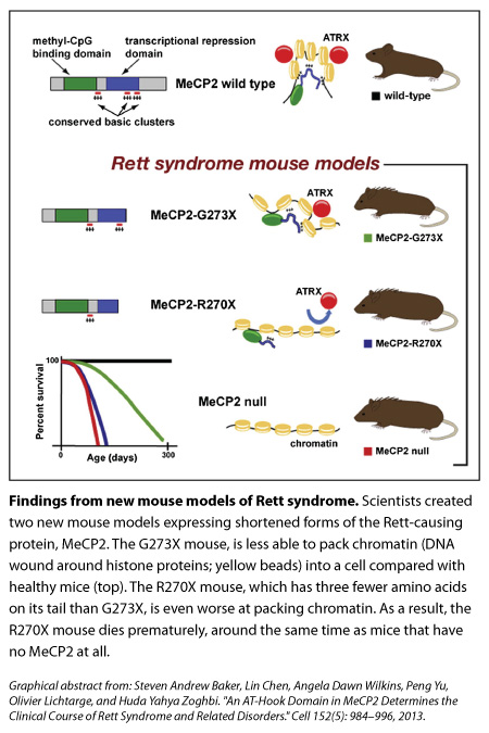 For Zoghbi, the new findings underscore the importance of going back to patients to look for clues about MeCP2’s function. In 1999, Zoghbi first showed that various mutations in MeCP2 caused Rett. “Here we are 14 years later, some of these human mutations are teaching us lessons,” she says. “The variety you get and the breadth of human features you can dissect and go back and study in the mouse are really very humbling.”