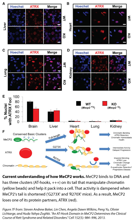 When the MeCP2 sits on DNA, and likely alters the way it packs into a cell, there are other molecular partners that come and join it. One of those is the protein ATRX—whose mutations have been linked to Alpha-thalassemia mental retardation syndrome—and Adrian Bird’s lab has previously shown that its interaction with DNA is disrupted in mice missing MeCP2. Zoghbi’s team decided to look at this protein in their new mutant mice.