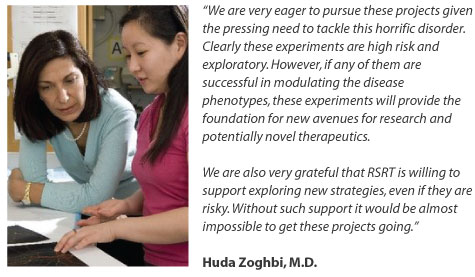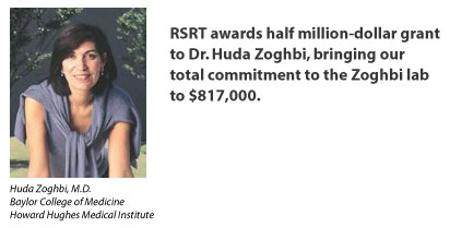 Today RSRT is pleased to announce that we are adding to our portfolio of potential treatment options with $515,054 of new funding for Huda Zoghbi and her lab. Dr. Zoghbi needs no introduction to anyone familiar with Rett Syndrome. She identified MECP2 mutations as the cause of Rett Syndrome in 1999 and has consistently added to our body of knowledge about the disorder, the animal models and the protein in the years since then. Simply put, the field of Rett would look very different without Dr. Zoghbi.