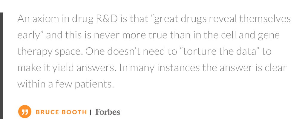 In contrast, several recent gene therapy trials have demonstrated profound efficacy that is easily documented and clearly meaningful. The articles in Science and Forbes highlight the potential for gene therapy to produce profound and unprecedented efficacy.
