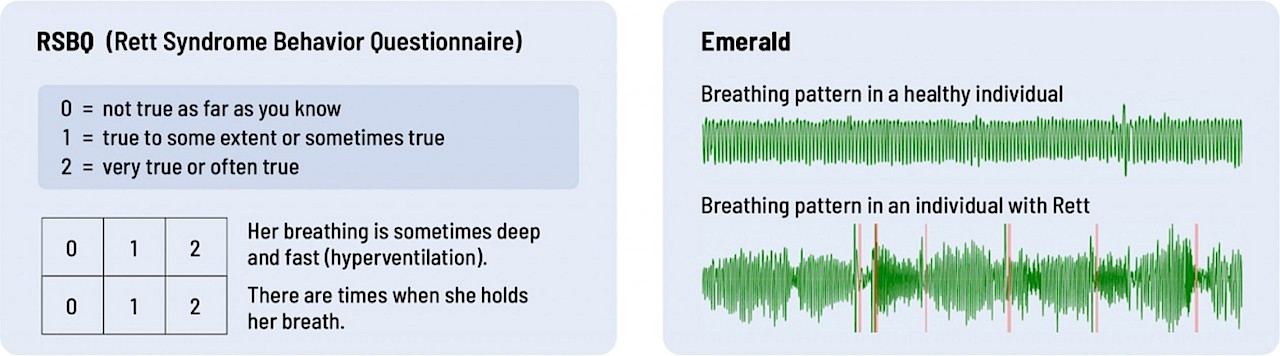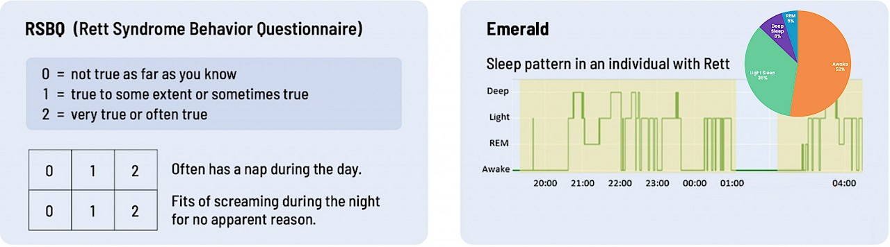Questionnaires completed by parents and clinicians who must observe and interpret an individual’s Rett symptoms at specified times during a trial are the standard way therapeutics are currently evaluated and approved. The problem is, rating scales measure what appears to be rather than what actually is. They are inherently subject to biases. For example, were the past few mornings particularly good or bad and therefore disproportionately influencing a caregivers memory of symptoms over the past month? If there is symptom improvement, is it real or is it wishful thinking or a heightened awareness of positive or negative events? Or what if the symptom under study isn’t present while they’re being observed by the doctor, or what if it is present but it isn’t the same as when they’re at home during the other 700+ hours between study visits?